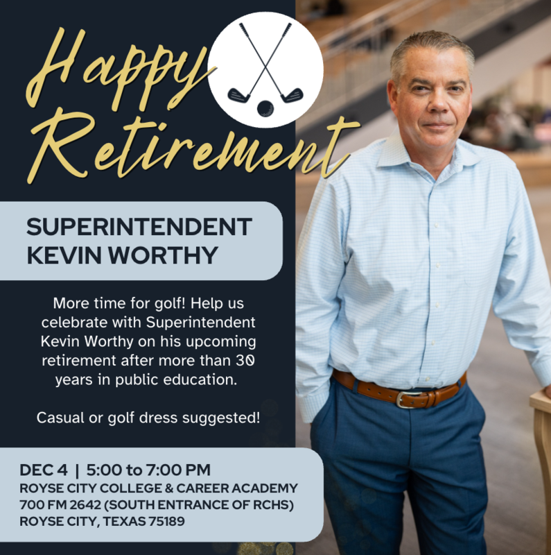 With nearly 31 years of service in Texas public schools and 12 years as superintendent of Royse City ISD, Kevin Worthy announced his retirement today. Mr. Worthy will continue to serve the district as superintendent through the end of the current semester and support the school board with a pending leadership transition. The Board of Trustees will begin discussions about the superintendent search and future leader of Royse CIty ISD. Deputy Superintendent Dr. Amy Anderson will lead the district as interim superintendent beginning in January of 2024.